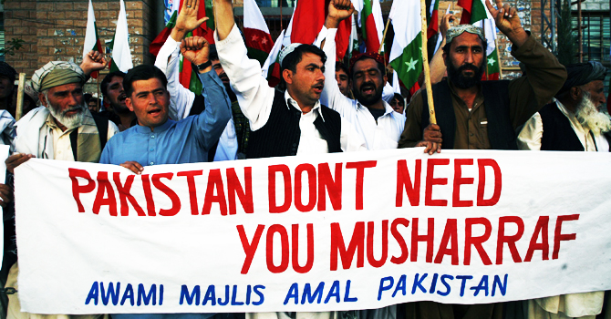 کوئٹہ میں عوامی مجلس عمل کے کارکن سابق صدر جنرل پرویز مشرف کی وطن واپسی پر ان کے خلاف مظاہرہ کر رہے ہیں۔ —. فوٹو رائٹرز